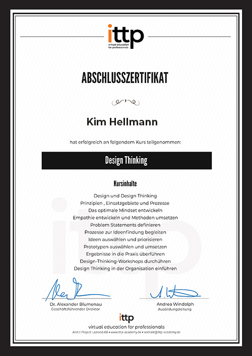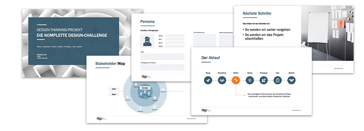 Während des Kurses erhalten Sie regelmäßig die Möglichkeit, Ihre gesammelten Erkenntnisse in einer PowerPoint-Präsentation zusammenzufassen. Auf diese Weise steigern Sie nicht nur den Lerneffekt, sondern Sie erstellen auch ein Dokument, das Ihren Fortschritt auf Ihrer ganz persönlichen Design-Thinking-Reise dokumentiert und prägnant zusammenfasst – mehr dazu später.